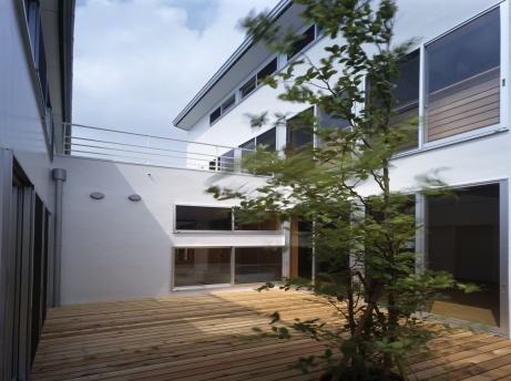| 2階中央は広いルーフテラス。正面の窓は浴室です。右はリビング、左は両親のリビング、中庭を通して、お互いのつかづ離れずの関係が構築できる。 |