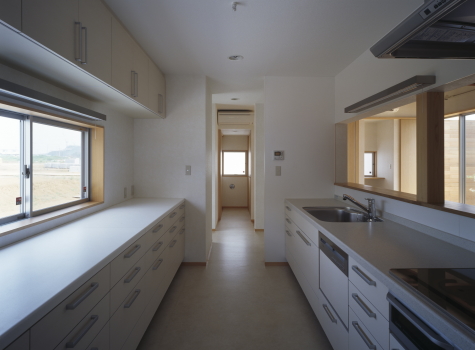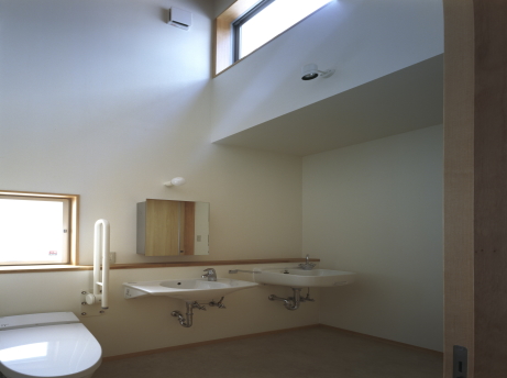 | 介護室とホールから進入できる介護用空間。車椅子でも対応できる用に配慮しているが、それだけでは駄目で、空間としても広く、明るくを基本としている。勿論、この空間は床暖房でないといけません。冬も暖かく快適に・・・。右は汚れ物を洗う専用洗い場。 |