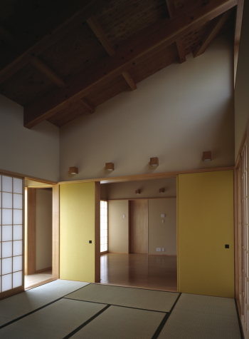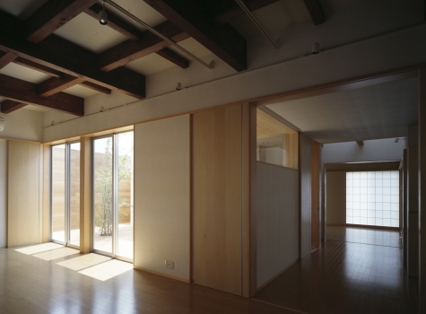 | 左がリビングで奥が中庭。右は玄関ホールとなる。手前の両開き扉の開閉で仕切れるようになっている。玄関から、お風呂のガラスを通して中庭の木に緑を楽しむ。奥が両親の寝室。で介護の場合はキッチンからでも親の様子が見れる工夫がある。そして、閉じて個室にも変身する。 |