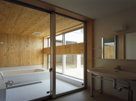 | バリアフリーの浴室。介護に配慮している。介護となるだけでなく、美しく中庭を眺めて、癒しの介護も大切。 |