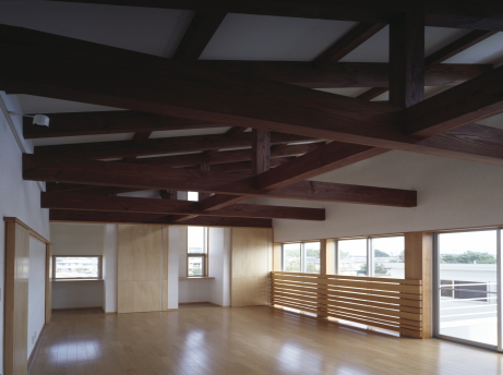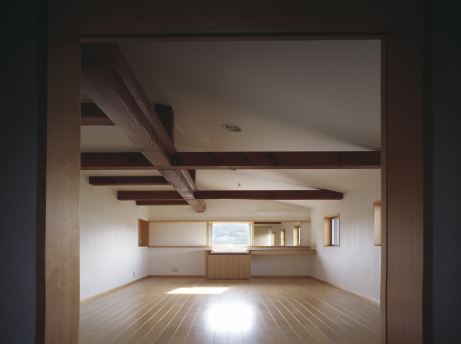 | ここは将来の子供部屋になる(?)予定の空間。当面は孫の遊び場・・・・。梁組を意匠的に見せて、飛騨高山風の光と影・・(^^;)ゞ・・・。将来、ロフト構築予定 |