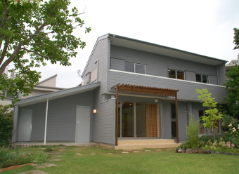 | 外壁はグレーとして重厚感をだした。リビング前のフェンスは撤去し、庭と連続性を重視した。 |